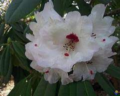 Stunnning large trusses of pure white flowers with a rose blotch in the centre.