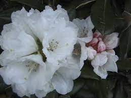 Soft cinnamon indumentum. Tight round trusses of pure white follow a light pink bud.